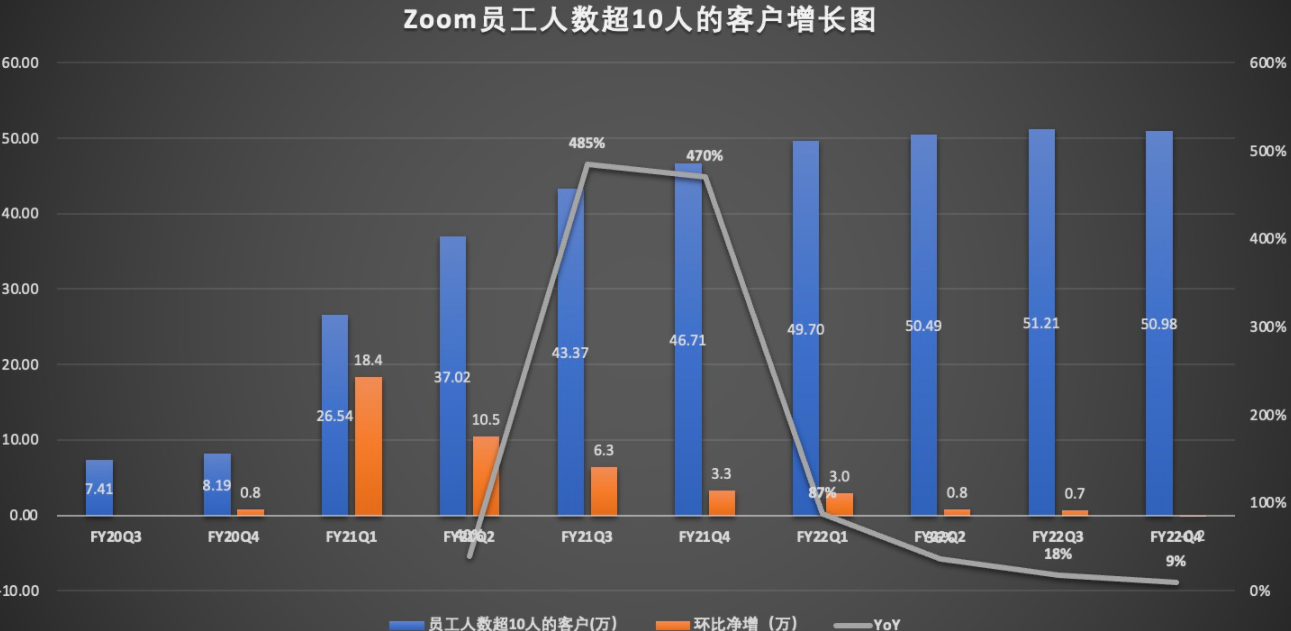 从上图可以看出,Zoom的客户数自2022财年Q1开始,增速就呈现了断崖式的下滑,本季度客户规模同比增速下降到个位数的增长,未来将持续承压。