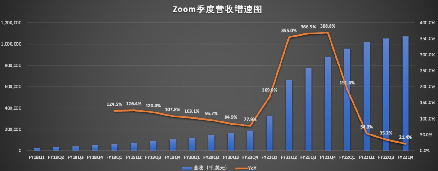 客户规模增长乏力,直接导致营收增速放缓。财报显示,2022财年Q4,Zoom总营收为10.714亿美元,与上年同期的8.825亿美元相比增长21%。