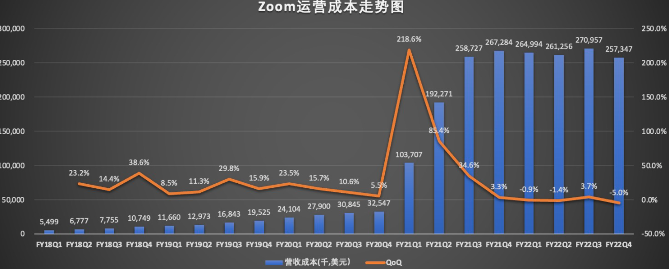 从2022财年伊始,Zoom就在有意识地控制运营成本。财报显示,2022财年第四季度Zoom的运营成本为2.57亿美元,较上年同期的2.67亿美元,减少了3.7%,较上一季度的2.71亿美元,减少了5%。