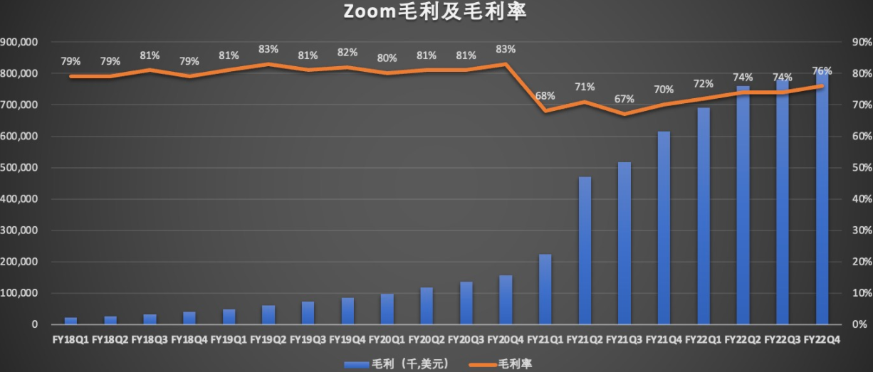 财报显示,Zoom第四季毛利为8.14亿美元,同比增长32.3%,毛利率从上年同期的70%,上升至本季度的76%,同样高出上一个季度2个百分点。