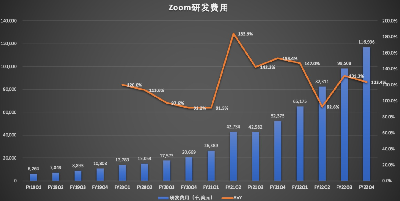 Zoom第四季度总运营费用为5.622亿美元,同比增长56.6%,环比增长15%。其中,研发费用为1.17亿美元,同比增长123.4%,环比增长18.8%,研发费用率从上年同期的5.9%上升至本季度的10.9%。