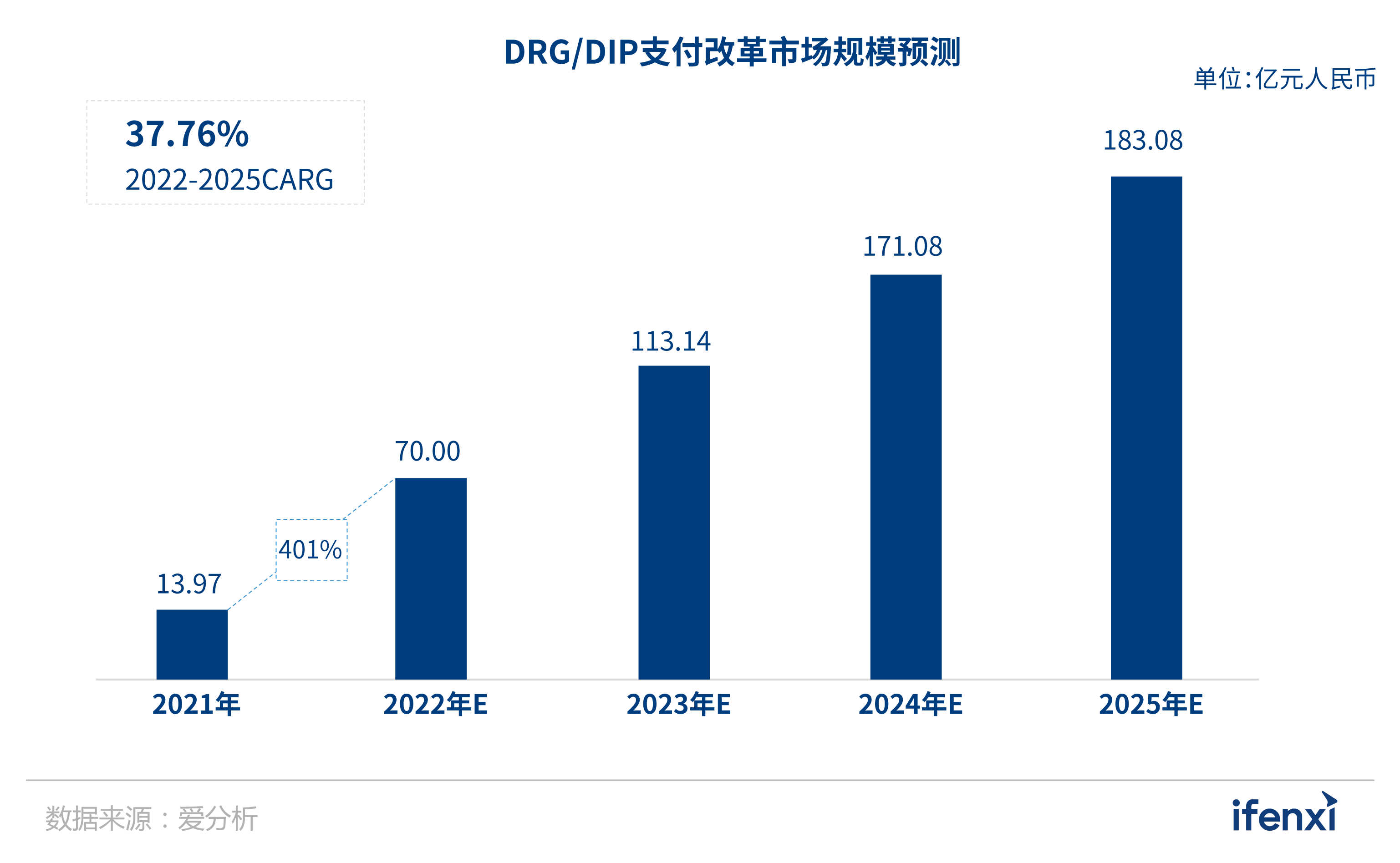 爱分析预测,预计2022年DRG/DIP市场规模约为70亿元,同比增速将超过400%。预计2023年市场规模将突破100亿元,2022-2025年年均复合增长率约为37.76%。《三年行动计划》完成后医院将进入数字化持续建设期,据爱分析测算2025年DRG/DIP支付改革带动市场规模约将超过180亿元。