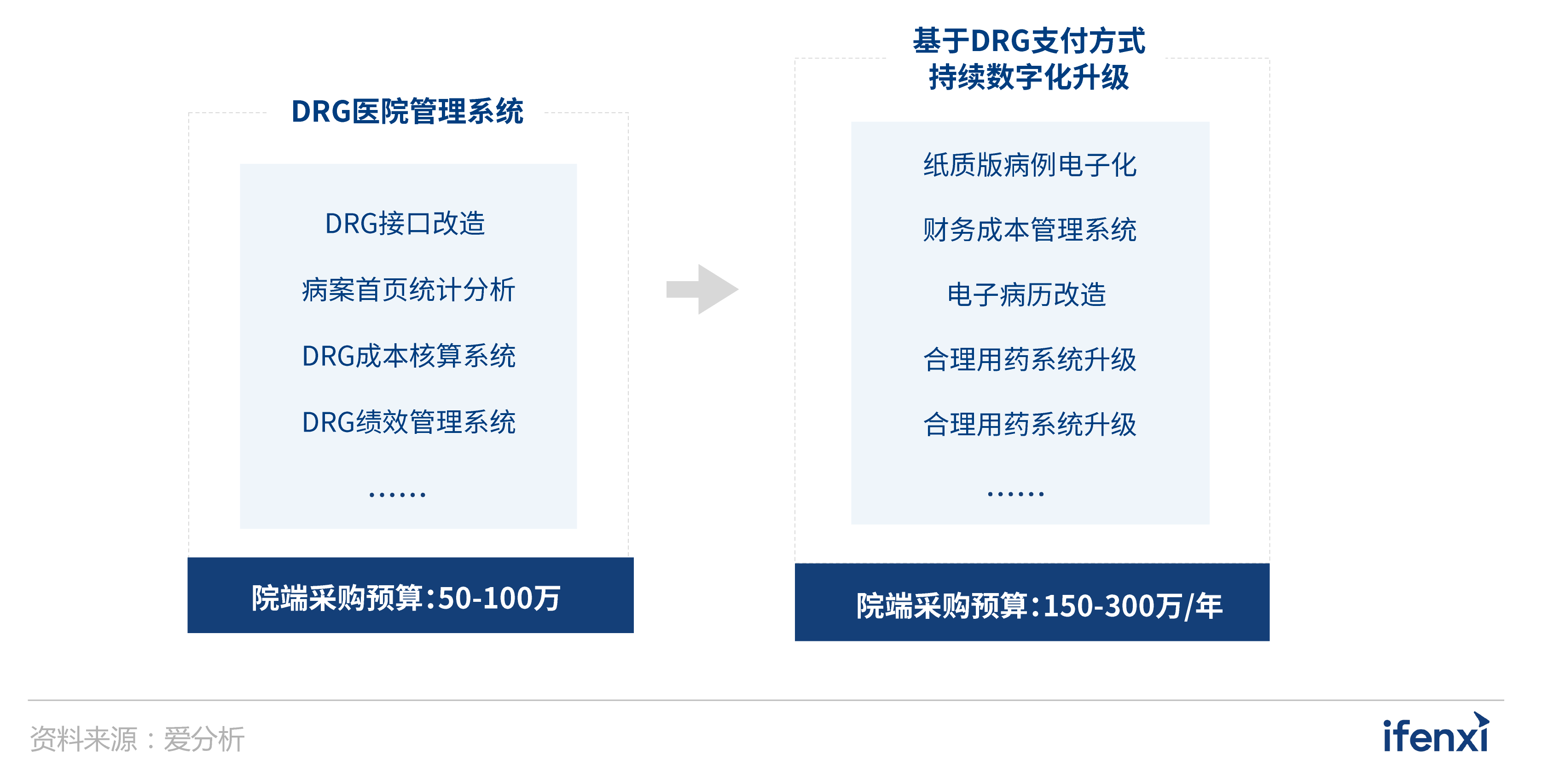 《三年行动计划》中明确提出先期启动试点地区要不断巩固改革成果,爱分析通过对2018年开始DRG改革的试点医院研究后发现,建立DRG医院管理系统后,基于精细化管理的要求,医院每年数字化升级采购预算多在150-300万之间。通过纸质病历电子化翻拍、升级财务成本管理系统,建立合理用药系统等项目对医院全维度数据进行治理。