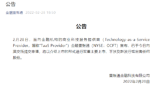 2月28日,金融科技云服务平台“金融壹账通”披露招股书欲回港二次上市。其将以介绍上市的形式进行双重主要上市,不涉及新发行或出售任何股份。