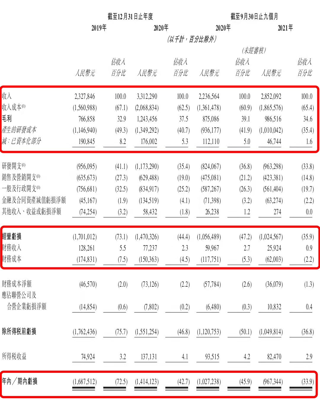 招股书显示,2019年公司经营亏损占收入已由73.1%減少至2020年的44.4%,而2020年9月30日止九个月的47.2%减少至截至2021年同期的35.9%。