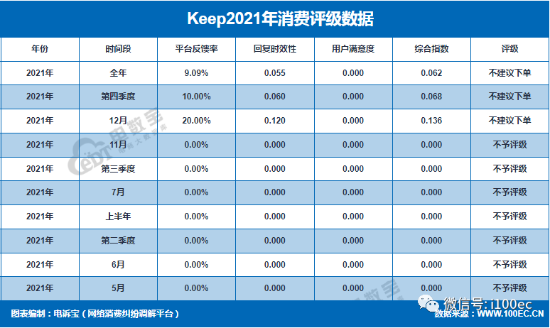 据“电诉宝”显示,2021年上海薄荷健康科技股份有限公司旗下“Keep”共获得10次消费评级,其中,3次获”不建议下单”评级,7次获”不予评级”评级,2021年一年整体消费评级为“不建议下单”。