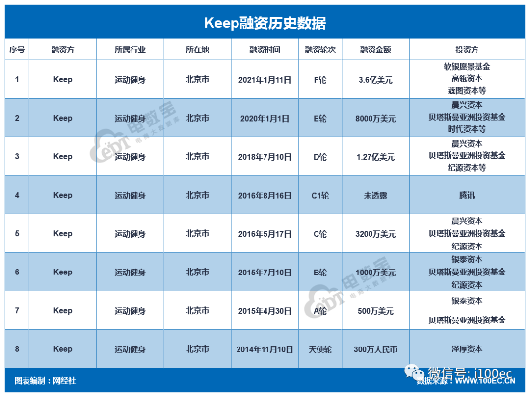 据网经社旗下电商大数据库“电数宝”(DATA.100EC.CN)监测数据显示,截止上市前,Keep已完成8轮融资,融资总额超42亿元人民币,投资方包括腾讯、高瓴资本、软银、纪源资本、贝塔斯曼亚洲投资基金等。