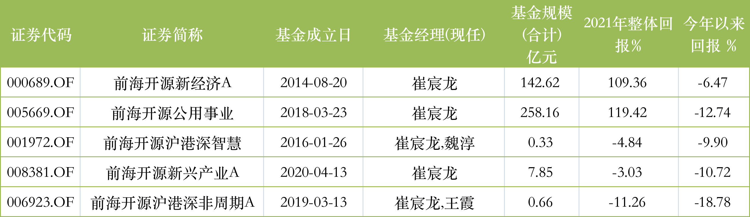 据wind数据显示,今年以来,崔宸龙管理的多只基金今年以来回报均为负值。其中前海开源公用事业今年以来回报为-12.74%、前海开源新经济、新兴产业分别为-6.47%、-10.72%。与其他两位基金经理共同管理的两只基金回报跌幅也均超过10%。