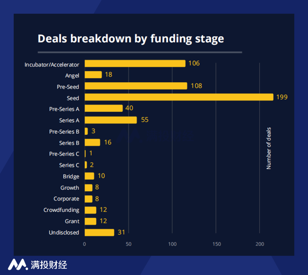 从投资来源来看,大多数针对初创公司的投资来源于MENA本地的投资者,以沙特阿拉伯的创投最为活跃,他们参与了214笔交易,其次是阿联酋的148笔交易,以及埃及的114笔交易。从投资轮次来看,大多数针对MENA地区的投资都集中于加速器(Accelerator)、pre-Seed和Seed轮融资,这表明进入市场的初创公司数量正在快速上升。