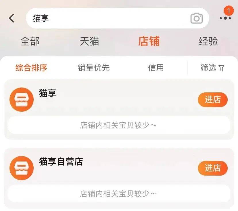 在手机淘宝App端,猫享没有做出任何形式的推广和露出。在手淘App商品搜索栏输入“猫享”,只会出现猫粮等商品;搜索店铺“猫享”,则会看到“猫享”“猫享自营店”两家没有图标的新开店铺,店铺中也没有任何商品。