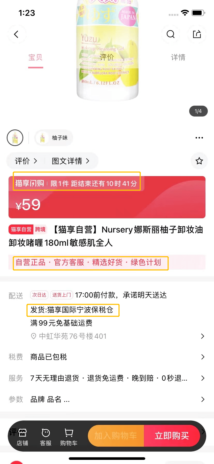在一款国外品牌的啫喱卸妆油界面,商品前除“猫享自营”还有“跨境”两个字,商品发货地则显示为“猫享国际宁波保税仓”,这款商品售价为59元。而在“天猫国际”店铺中,同样品牌和容量的这款卸妆油,发货地为“义乌心怡保税1号仓”,售价则为118元。