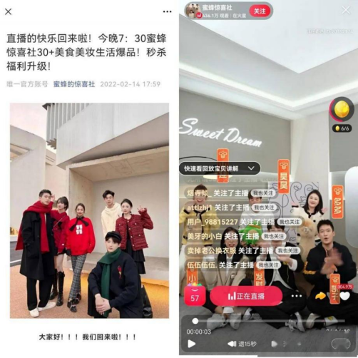 而“跌倒后”的薇娅,在外界看来,是以“蜜蜂惊喜社”的形式重新回到了这个行业。这家成立于去年8月的公司,有5位主播曾经是薇娅的助播,其中更有薇娅的侄女多多在列。