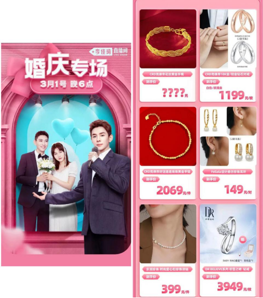 据李佳琦3月1号直播预告清单抢先版显示(最终版预告直播前一小时发布),这次直播涵盖婚嫁专区(黄金视频、珠宝钻戒、婚纱礼服、婚纱照等)、宴请专区(酒水、坚果零食、喜糖等)、妆发专区(美妆用品)和助播专区(衣帽服饰)。涉及品牌有:克徕帝、DR、GXG、太平鸟、迪士尼、古井贡酒、张裕、费列罗等二十多个品牌。