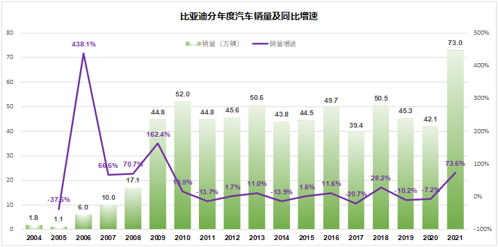 2021年,是比亚迪突破销量近十年“原地杵”的关键一战,去年全年,比亚迪共销售汽车730093辆,其中单是新能源乘用车593745辆的成绩,就已经超过了比亚迪有史以来所有的年度销量。