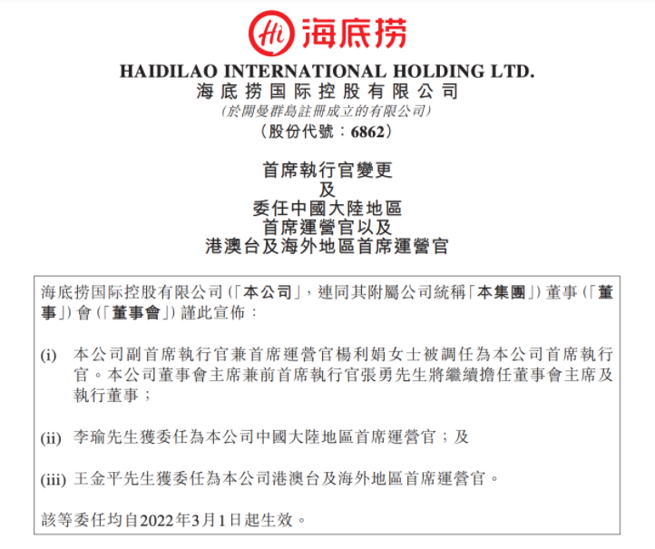 3月1日,海底捞发布了新的人事任命,公告称,海底捞董事会主席张勇辞任CEO一职,接替张勇的是公司的副首席执行官兼首席运营官杨利娟。任命生效之后,张勇继续担任公司董事会主席以及执行董事。另外,李瑜出任海底捞中国大陆地区首席运营官,王金平出任港澳台及海外地区首席运营官。