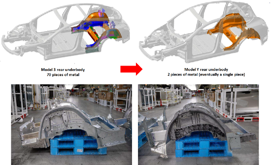 特斯拉Model 3后底板有70多个零部件,而使用一体化压铸技术后,Model Y的后底板仅有两个大件,焊点也由约700-800个减少到50个。