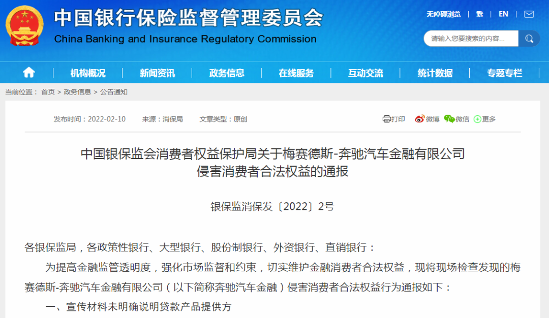 2月9日,银保监会消费者权益保护局发布《关于梅赛德斯-奔驰汽车金融有限公司侵害消费者合法权益的通报》。