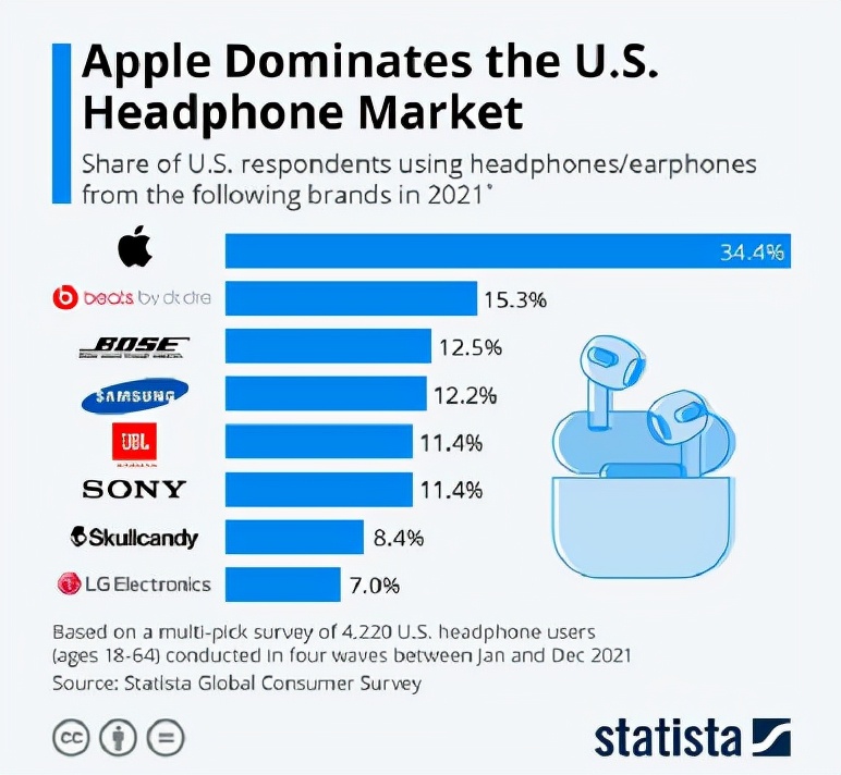 根据statista数据显示,在美国,近50% 受访的美国消费者,有苹果AirPods 或Beats耳机产品。苹果AirPods市场份额占比第一(34.4%),苹果旗下的 Beats by Dre占比第二(15.3%)。