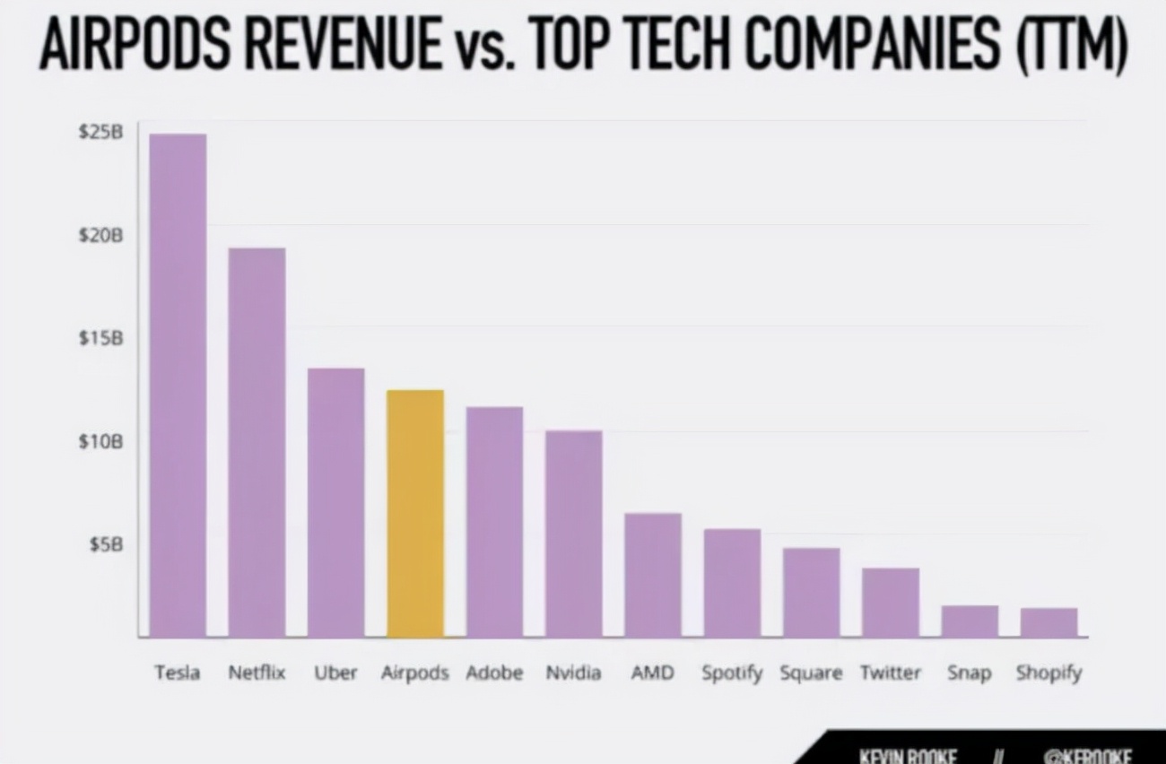有数据显示,苹果公司Airpods每年可带来的收入,几乎是Adobe和Uber的总收入的两倍,是AMD 2020年的收入的两倍。