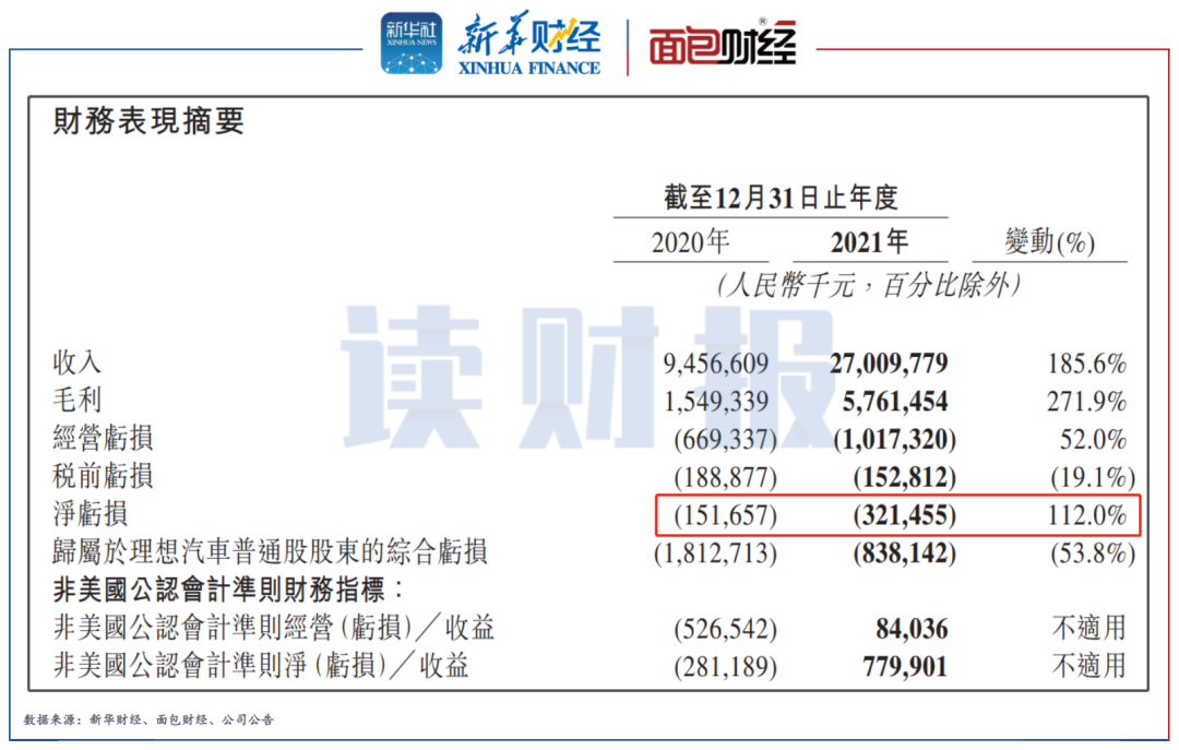 几家造车新势力企业中,理想汽车率先交出2021年度业绩答卷,亏损同比扩大近一倍。