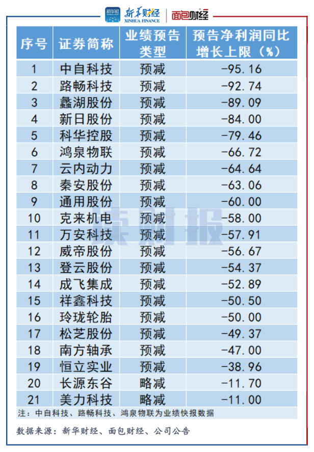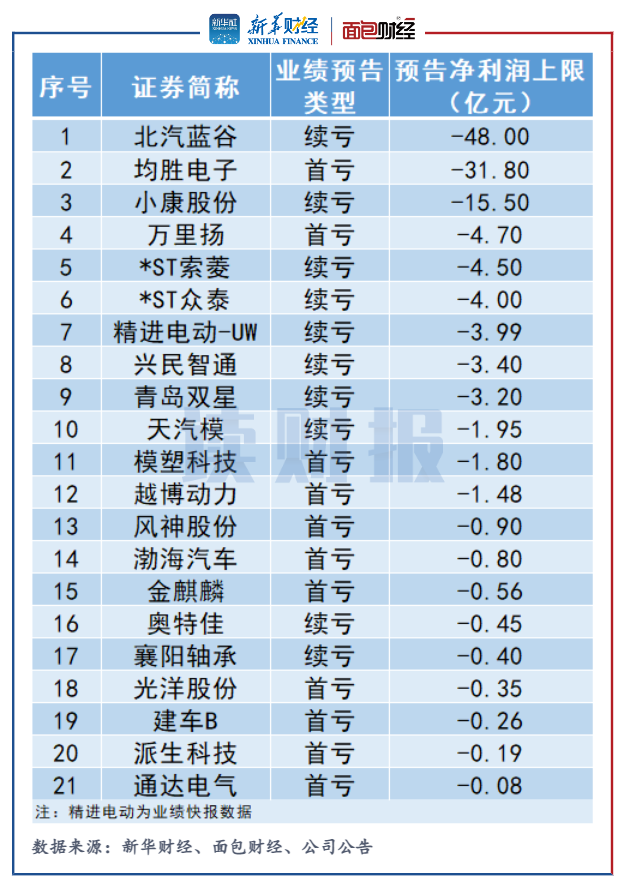 此外,万里扬、*ST索菱亏损上限在4亿元以上,精进电动、兴民智通、青岛双星亏损上限均达3亿元以上。