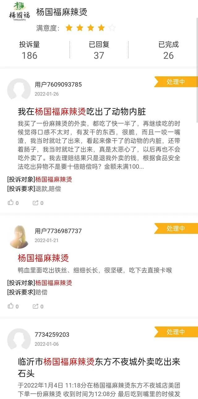 而在新浪黑猫投诉平台中,大量消费者投诉杨国福麻辣烫中吃出铁丝、动物内脏、虫子、头发等异物,更有消费者因食用杨国福麻辣烫导致肠胃炎、被异物刺伤嗓子等申请理赔。