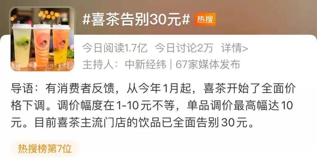 近日,喜茶大规模调整产品价格,宣布告别30元以上产品,给饮品赛道投下一枚重磅炸弹。
