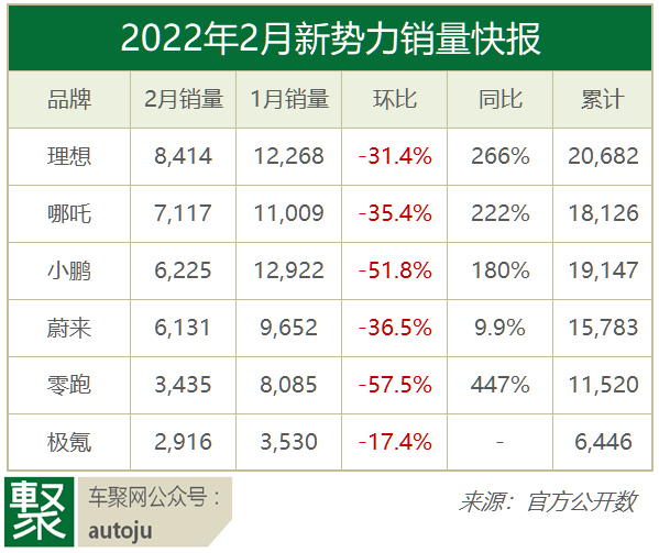 受春节假期、零部件供应以及疫情等因素影响,新势力2月销量都出现环比大降,未有一家销量过万。