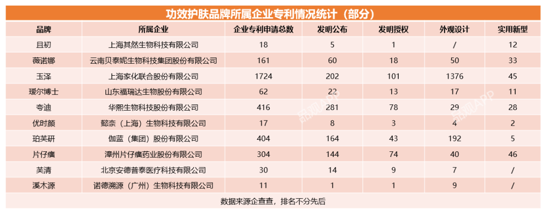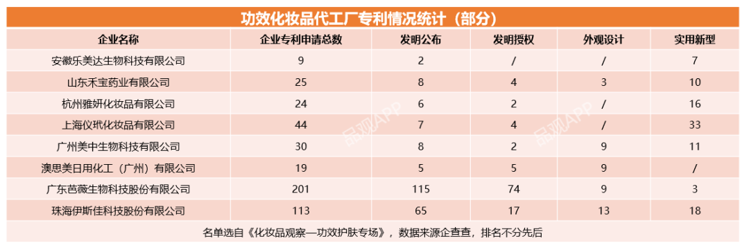 老牌国货中,片仔癀主打“功效型护肤”,在研发上积累下深厚的基础,专利申请数量超过300项;而如乐美达、雅妍、仪玳等功效化妆品代工厂,也在“专利”上狠下功夫。