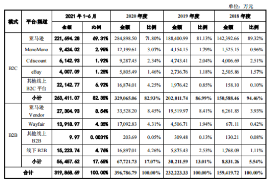 招股书显示,截止报告期,亚马逊平台销售收入分别占比93.25%、89.54%、80.25%和77.85%。其中,B2B模式在亚马逊平台收入占比为3.93%、8.41%、8.45%、8.54%,呈逐年上涨趋势。