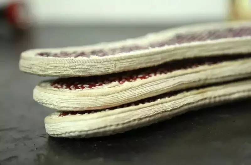 千层底做工复杂且难度大、耗时长,还需经过剪裁底样、纳底切底、填制千层底等工序,鞋底用布二十多层,耗费鞋线二十多米。且手工纳底要求每寸见方,纳一双千层底至少两千多针,有的还会达到四千多针,针数多为4222、4666、4888等吉祥双数。一双简单的鞋子,为什么有这么复杂的工艺,毛阿姨的回答是:“千层底那个东西对人的身体有好处的,很养脚,一针一线纳起来,会帮你按摩的,现在人脚气那么多,穿了这种鞋子就没有了。”
