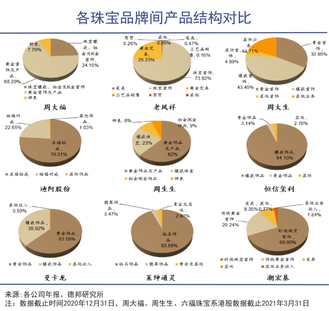 以周大福、老凤祥为代表的大众类头部品牌拥有更庞大和全面的产品体系,再加上拥有几十年甚至上百年的历史为背书,品牌具有庞大的消费者群体和成熟的渠道遍布,占据有利的市场位置。