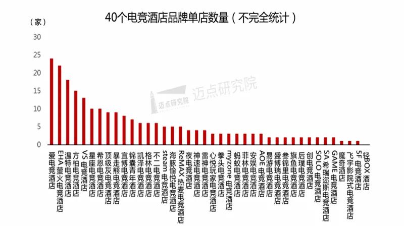1、电竞酒店数量据迈点研究院监测,监测时间为2021年1月1日-2021年12月31日,现迈点研究院监测的电竞酒店品牌共有40个,据不完全统计,这40个电竞酒店品牌拥有单体酒店232家,其中品牌单体酒店数量排名前三的是爱电竞酒店、EHA萤火电竞酒店和温特电竞酒店,分布拥有单体酒店24家、22家和18家。