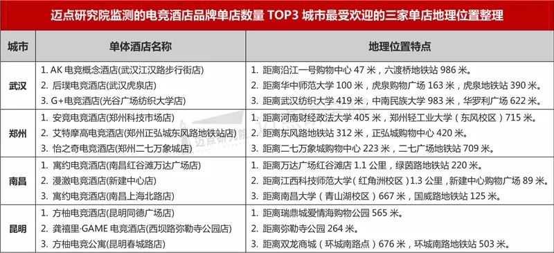 3. 重点城市商圈分布特征在迈点研究院监测的电竞主题单体酒店所在城市分布的数量中武汉拥有的单体电竞酒店数量最多有27家占总规模的11.64%,其次是郑州拥有14家,南昌和昆明拥有13家并列第三。据相关数据整理得知,最受欢迎的电竞酒店门店大多数地理位置在地铁站、购物中心以及高校附近,这些地区有着交通便利、生活设施完善、人流量大、人口年轻化等特点。