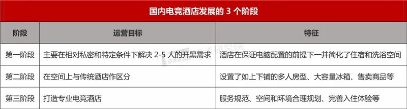 6、拓展分析国内电竞酒店的发展呈现出3个阶段,目前已进入第三阶段,即专业型电竞酒店品牌出现并正在逐步扩大规模,如爱电竞酒店、EHA萤火电竞酒店和温特电竞酒店的崛起。而格林豪泰、速8等经济型连锁酒店也抓住风向进行快速转型,如格林酒店集团推出的新晋特色品牌“格林电竞酒店”。其次,传统酒店品牌与平台型企业合作加入到这个新兴行业,如腾讯游戏、腾讯电竞、杭州欧愉科技将与香格里拉、凯悦、万达、雅诗阁等进行合作打造全场景的电竞游戏主题酒店。