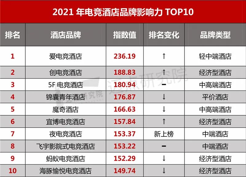1、整体品牌指数根据迈点研究院数据整理得出2021年度电竞酒店品牌影响力TOP10为爱电竞酒店、创电竞酒店、5F电竞酒店、锦囊青年酒店、魔奇酒店、宜博电竞酒店、夜电竞酒店、飞宇影院式电竞酒店、蚂蚁电竞酒店和海豚愉悦电竞酒店。