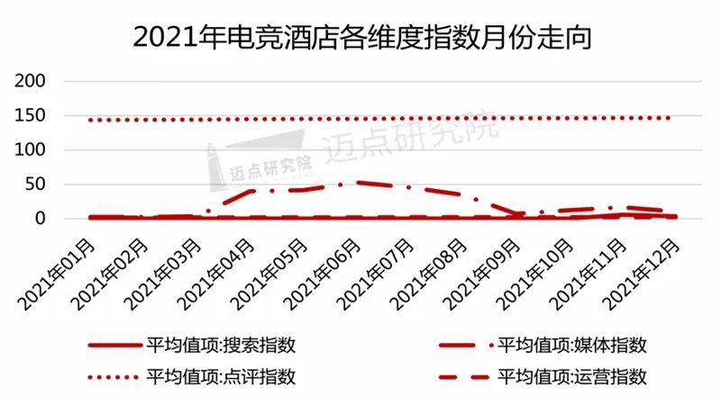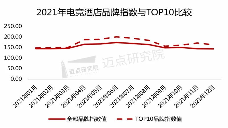 从2021年1月至2021年12月的品牌指数月度走向来看。2021年度所有电竞酒店的品牌指数均值为153.38,2021年度TOP10电竞酒店的品牌指数均值为170.7,超出所有电竞酒店品牌指数均值11.29%。这证明了TOP10电竞酒店拥有较好的用户基数和声誉,且TOP10在潜在客群获取、媒体新闻发布、营销推广和客群口碑点评方面进行着良性积极地运营。
