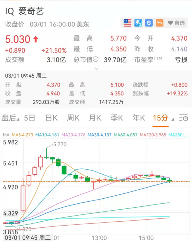 从财报数据来看,第四季度,爱奇艺总营收为74亿元,同比持平。归属于爱奇艺的净亏损为18亿元。2021年爱奇艺营收为306亿元,同比增长3%。这份财报和龚磊的态度,让资本市场拍手叫好,财报发布后爱奇艺股价大涨,最高涨至30%,截至发稿前股价上涨21.5%。