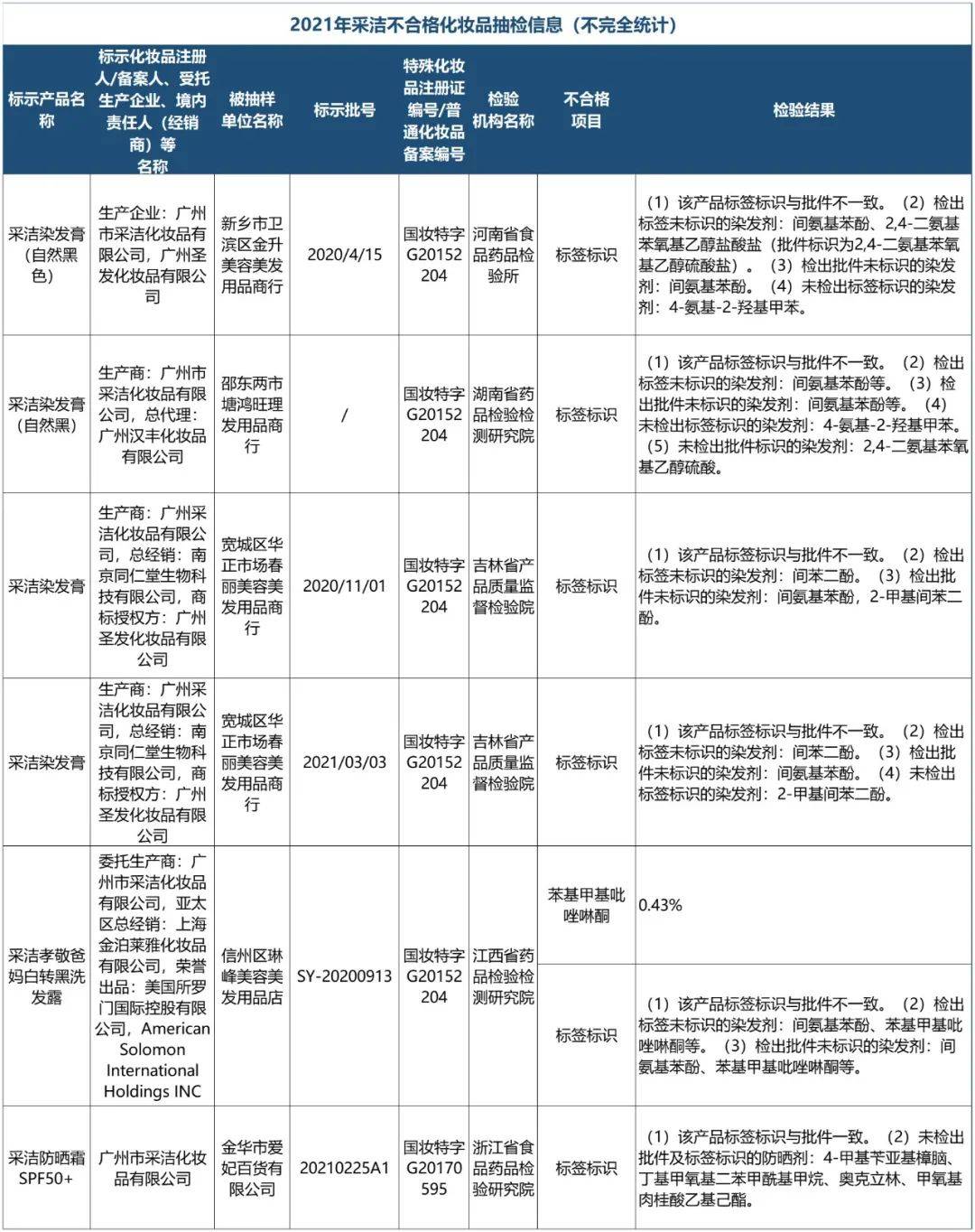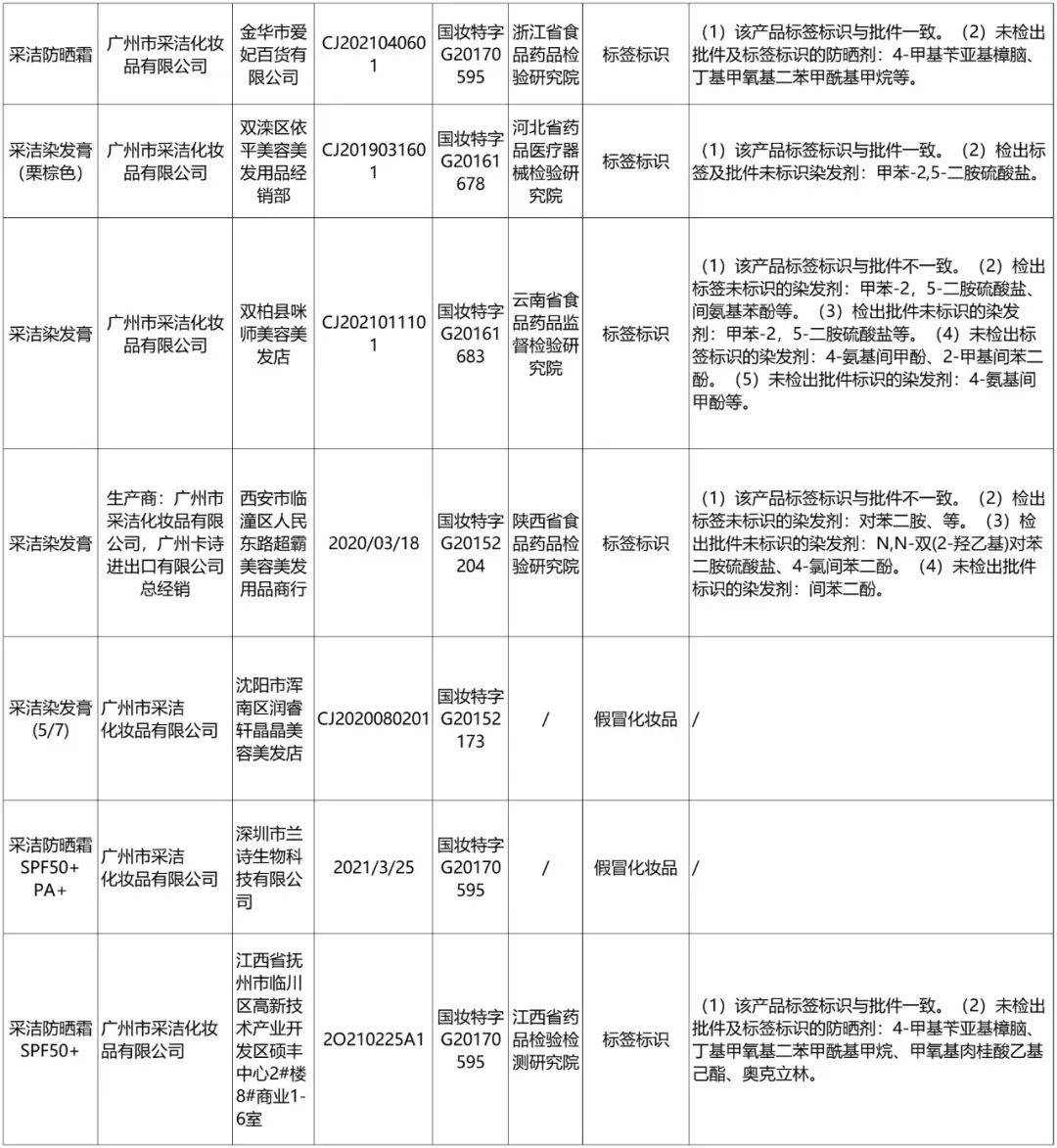 据青眼不完全统计,2021年,国家和各地监管部门通报标示为采洁公司的不合格样品,主要包括防晒霜和染发膏两大类,这些产品一般来自于美容美发店、商场、化妆品零售店等。