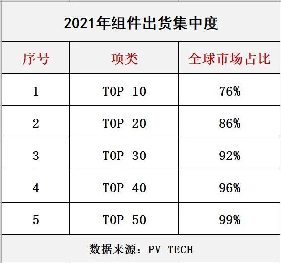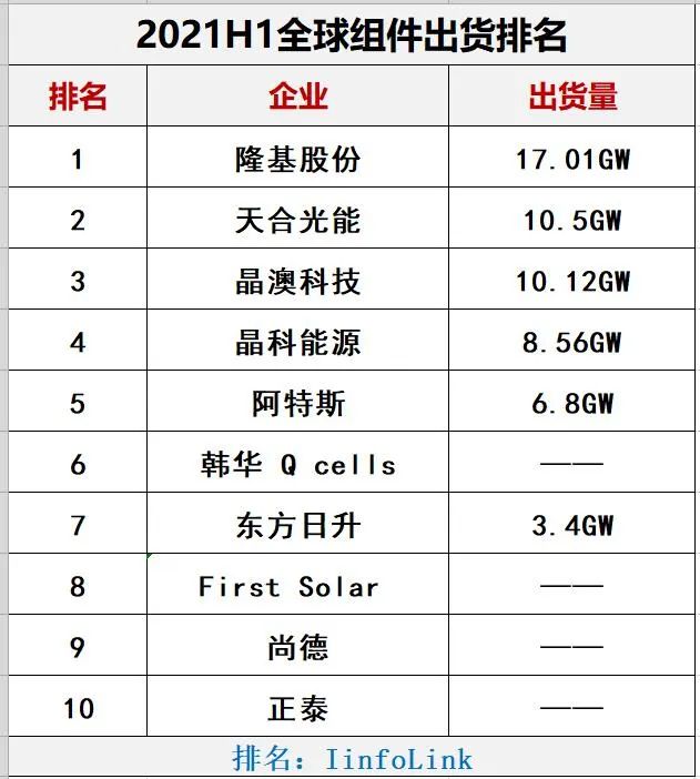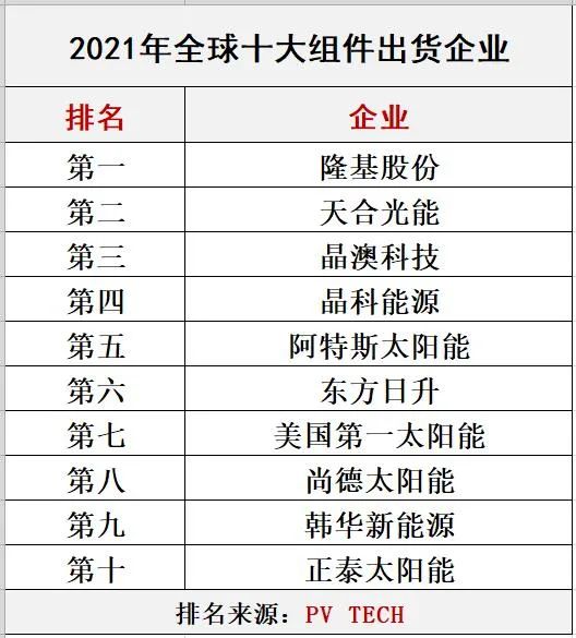 2021年排在全球前10名的组件品牌的出货总量接近150GW。在前十名企业中,中国企业占了8个席位,且前六名均是中国企业,他们依次是隆基股份、天合光能、晶澳科技、晶科能源、阿特斯太阳能和东方日升。同时,在2021年,不少于24家公司的年出货量超过了1GW水平;其中4家公司的出货量远远超过了20GW——这是2021年可被列为重量级的新水平。