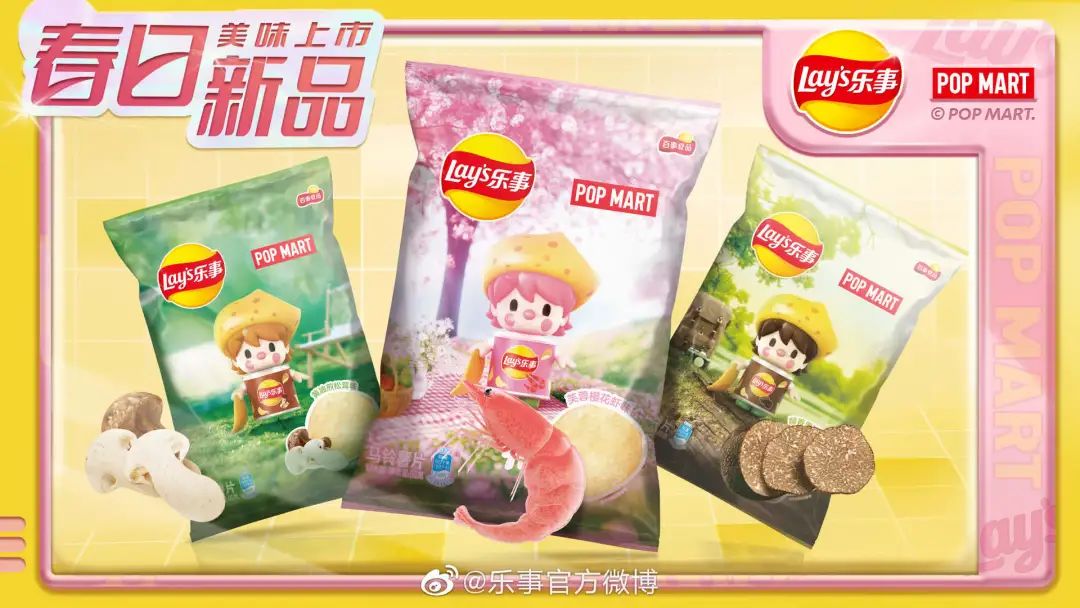 早在1月6日,乐事就在微博官宣释放春天的信号,携手泡泡玛特推出春季限定的芙蓉樱花虾味、醇香黑松露味、黄油煎松茸味薯片,迎合春日里野餐、露营、踏青等多种户外活动,伴随人们一起享受这春光明媚。