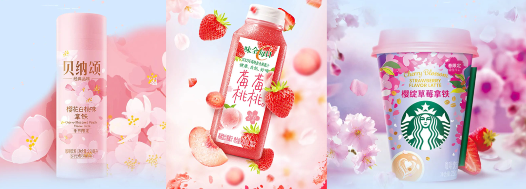 主攻便利店的味全、星巴克、贝纳颂也纷纷焕新,带有“霓虹国”气息的味全每日使用日本久保水蜜桃、美十三草莓打造春日限定的莓莓桃桃果蔬汁,寓意“莓”开眼笑、“桃”你喜欢,谐音梗倒是很讨趣。星巴克的樱花草莓拿铁、贝纳颂的樱花白桃拿铁皆是集结了春日最常用的元素,在用料上也与以往一样秉承着高水准,企图在竞争力极大的货架上更胜一筹。