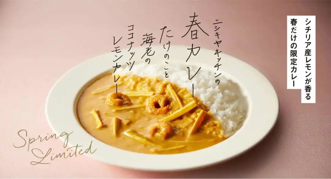 咖喱是日本最常见的料理之一,蒸煮食品制造商Nishiki Foods Co., Ltd.的自有品牌 NISHIKIYA KITCHEN推出的春季咖喱(竹笋和虾夷椰子柠檬咖喱)除了融入春季特有食材竹笋外,酱汁上还使用芫荽和姜黄等多种香料,虾的味道与椰奶粉相结合,打造出适合春天的味道的温和咖喱。