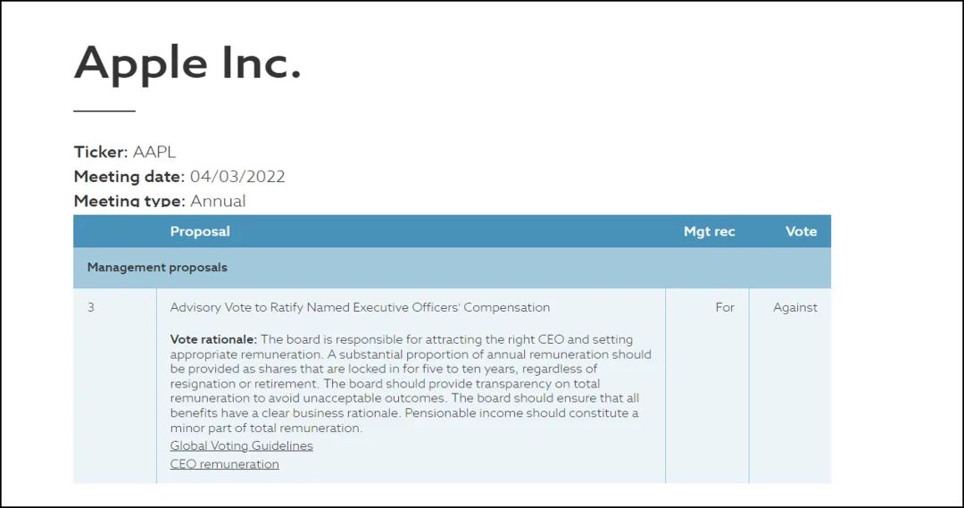 就像GPFG对苹果薪酬方案的反对意见,就是采纳了ISS的投票建议后得出的。