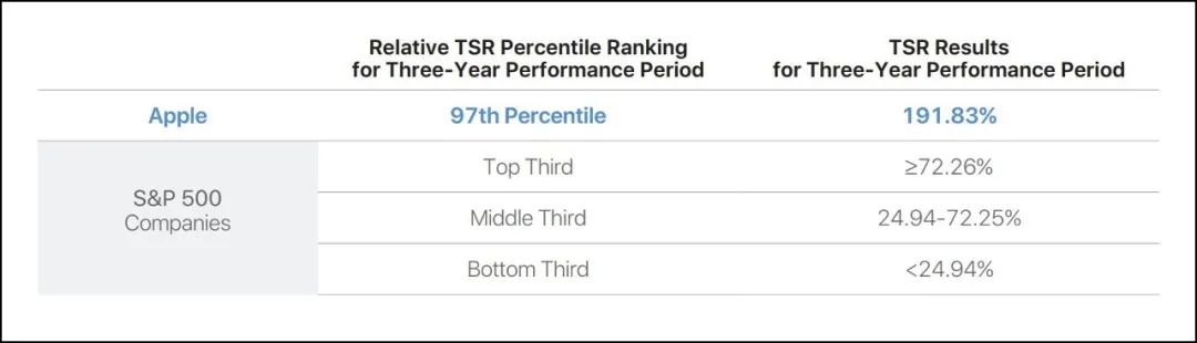 而实际上,苹果过去三年的股东总回报率为191.83%,远远大于前三分之一的分界线(72.26%)标准。因此,库克顺利获得了这些股票奖励。