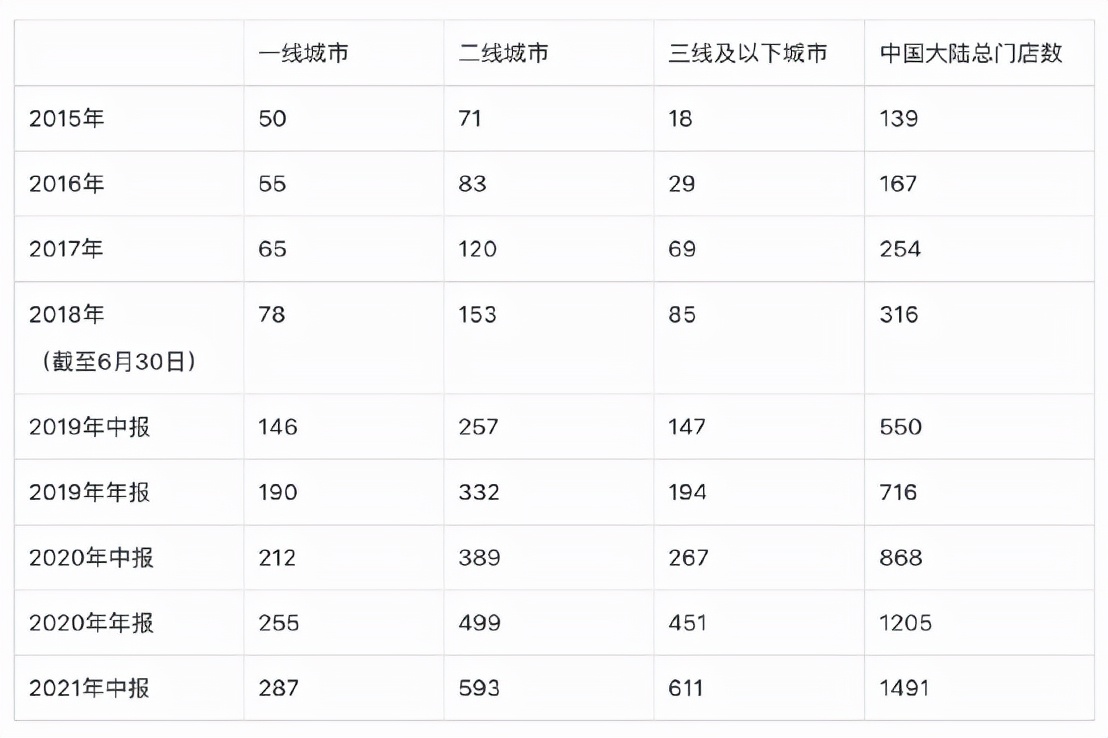 2015年,海底捞在中国大陆的总门店数为139家,到2016年,变为167家,同比增长20%。2017年,中国大陆总门店数同比增长52.1%至254家。到2018年6月30日,其大陆总门店数增长至316家,半年净增62家。