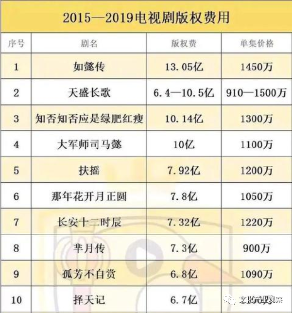 在2016年,爱奇艺也曾坐上过用户数量第一的宝座,但靠的却是大笔烧钱购买影视版权。行业内卷导致版权费水涨船高:2017年《孤芳不自赏》、《择天记》、《三生三世十里桃花》三部影视剧的版权费都超过了6亿元。2018年新丽传媒出品的《如懿传》,版权费更是高达13个亿。