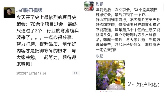 今年一月底,两条朋友圈更是让影视行业从业者倍感压力,一条来自腾讯视频高管:“70余个项目过会,最终只通过两个”,而另一条则来自优酷高管:“53个剧集项目过绿灯会,最后只锁了一个IP。”