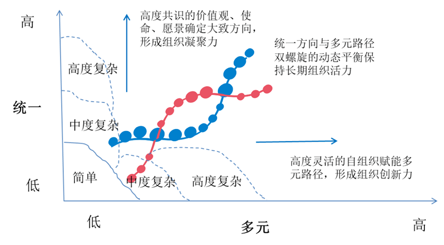 为了进一步说明双螺旋机制,我们采用社会学科(包括管理领域)最为古老、最为核心的一对矛盾悖论,即“统一”与“多元”,以这两个维度为基础构建一个矩阵。如图所示,纵向维度专注“统一”,尤其是以企业文化的价值观、使命、愿景为基础所构建有关大致方向的共识,形成组织凝聚力;横向维度专注“多元”,尤其是赋能不同路径所需要的企业能力多元性与多变性,形成组织创新力(突破性创新力)。