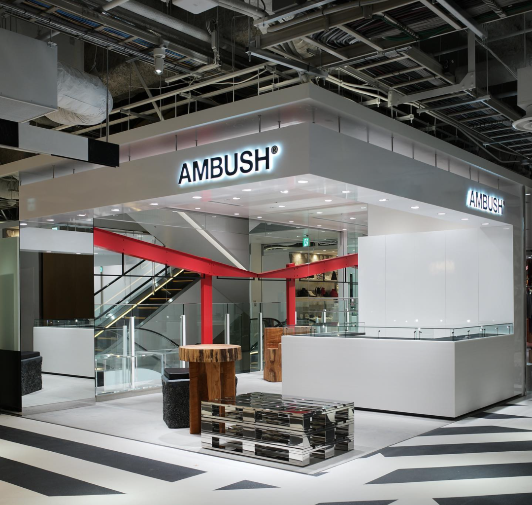 AMBUSH 日本的两家门店特别邀请了日本知名的室内设计师片山正通、及其工作室 Wonderwall 打造。门店内陈列品牌产品系列的同时,还陈列有给予设计师灵感的杂志和艺术书籍。片山正通本人曾操刀设计了全球众多知名的零售空间,例如上海环贸广场iapm、优衣库上海南京西路全球旗舰店、THOM BROWNE 日本首家旗舰店等等。